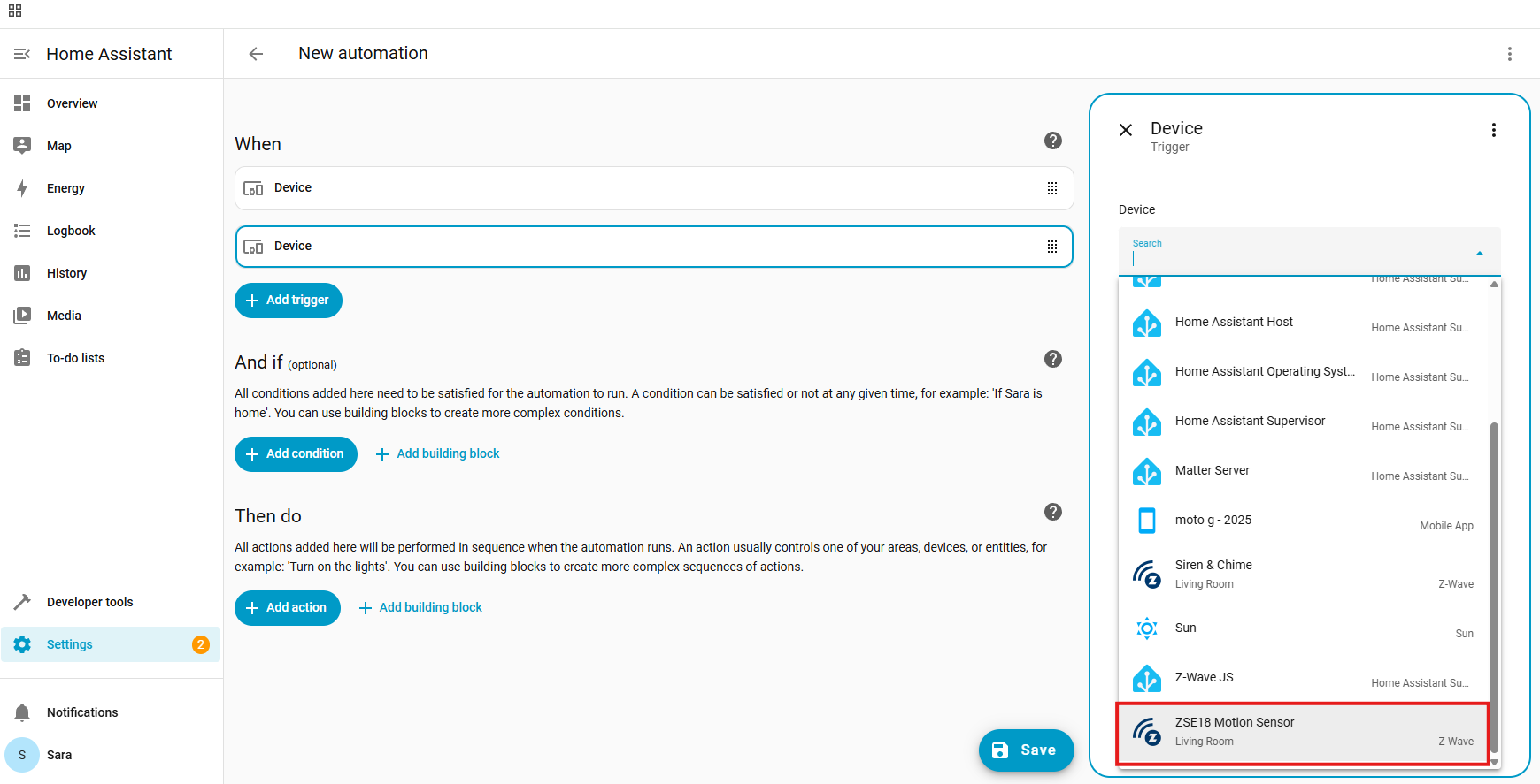 7. Select your trigger device. In our example, we will be using the ZSE18 Motion Sensor: