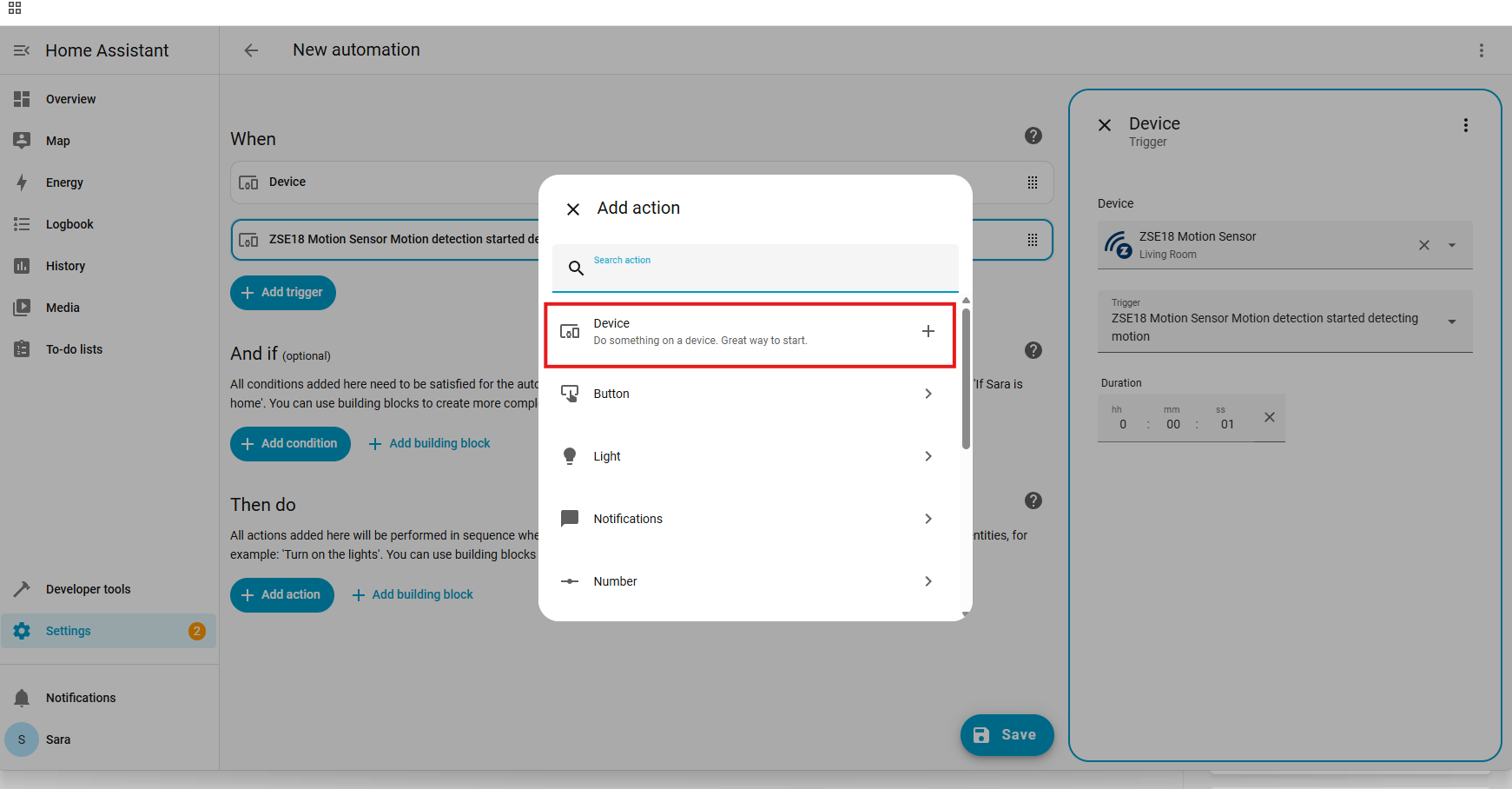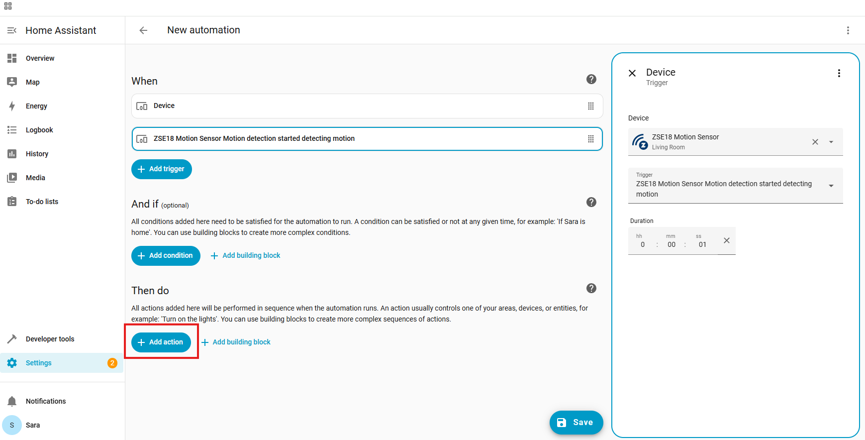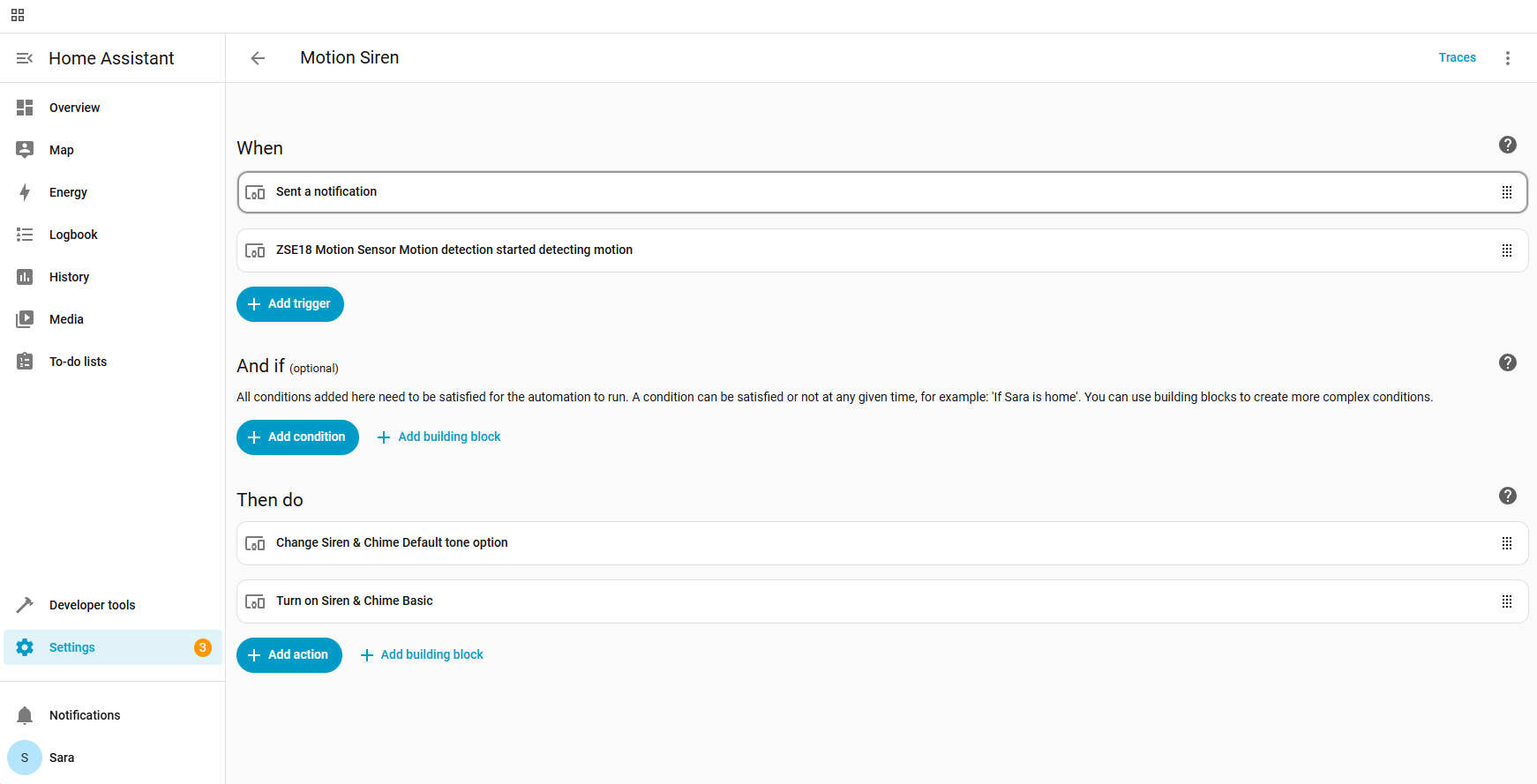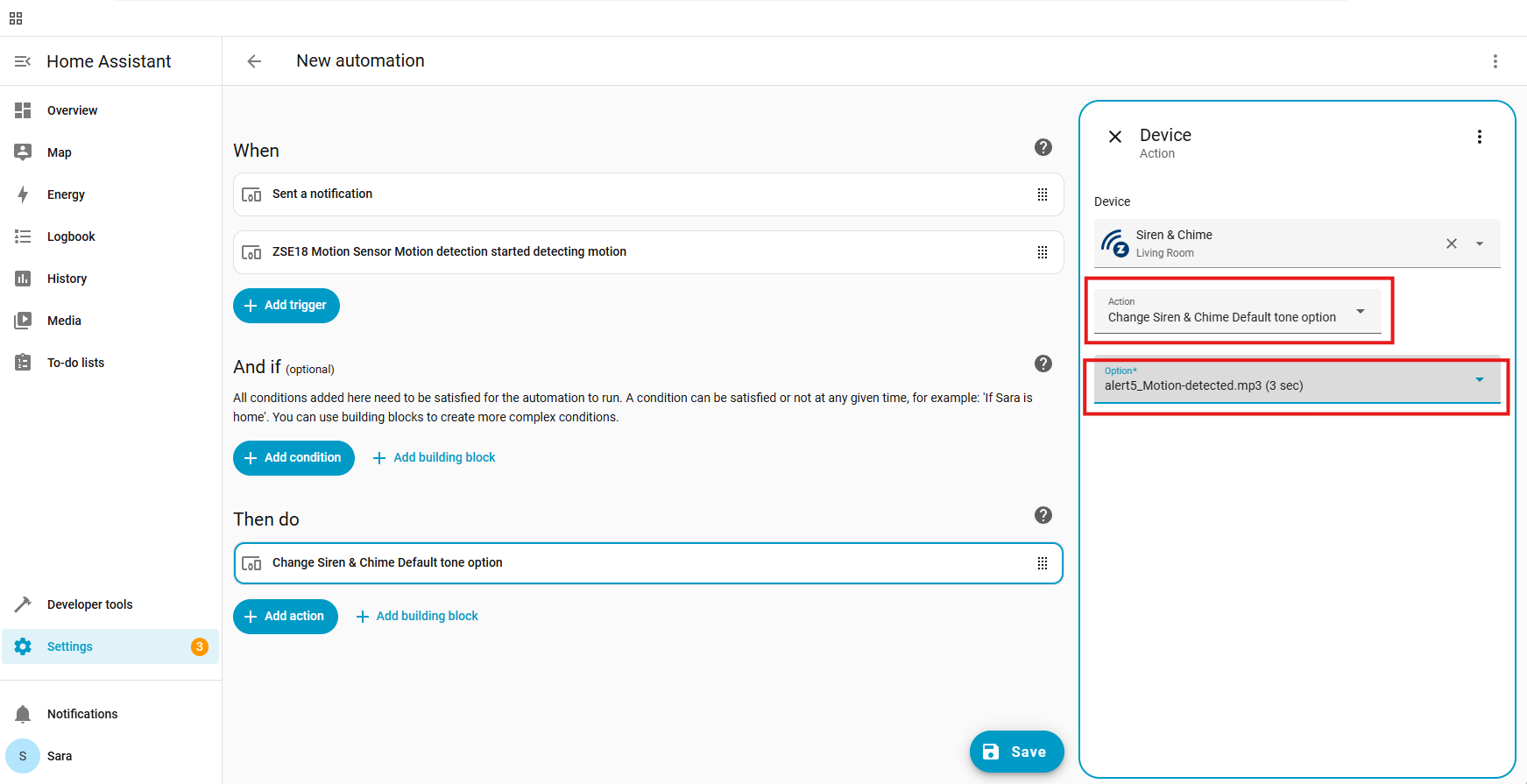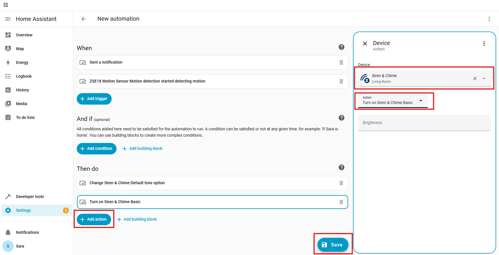 12. DO NOT SKIP THIS STEP: Click +Add action again. Select the ZSE50 Siren & Chime as the device. Action > Turn on Siren & Chime Basic. Click Save.