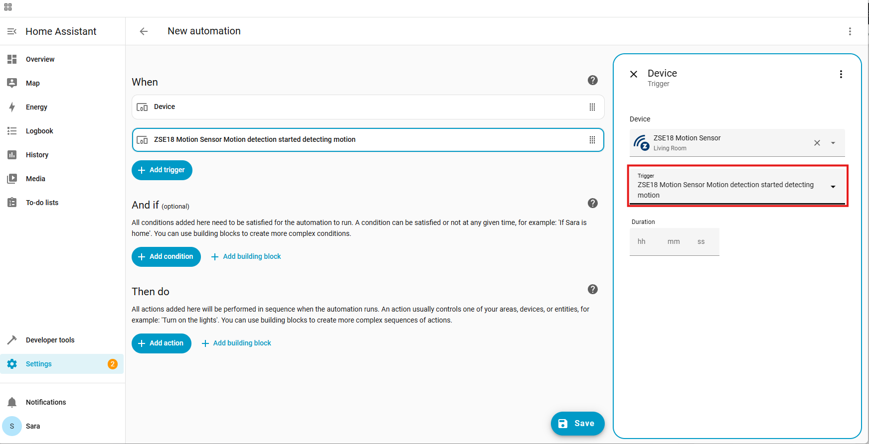 8. We are using Motion Detected in this example. In the second drop down box, select the trigger. In this instance, it is ZSE18 Motion Sensor Motion detection started detecting motion: