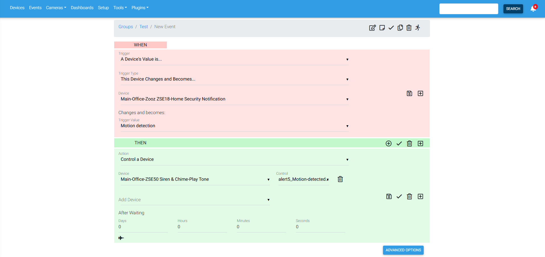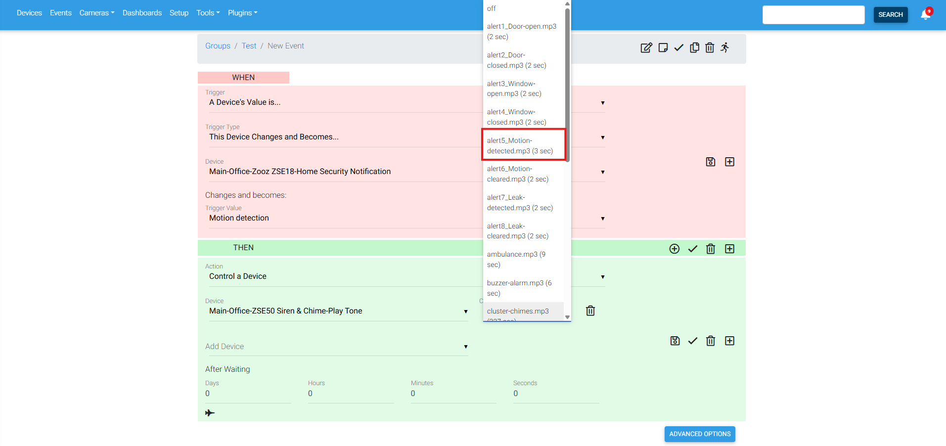 Below we've included some screenshots detailing how to program a simple automation for the Siren to play the Motion Detected alert when motion is detected on the ZSE18 Motion Sensor: