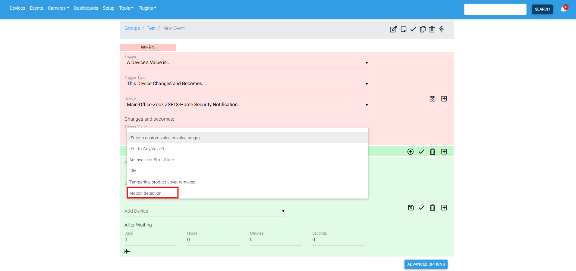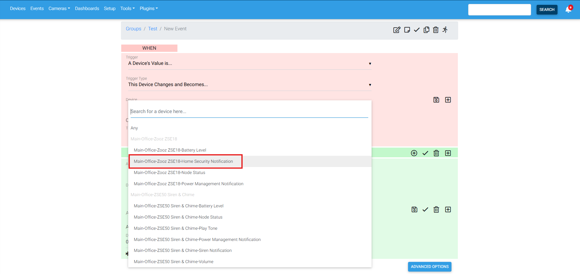 4. Under Device, select the device that will trigger the automation. Here we are selecting the ZSE18: Home Security Notification.