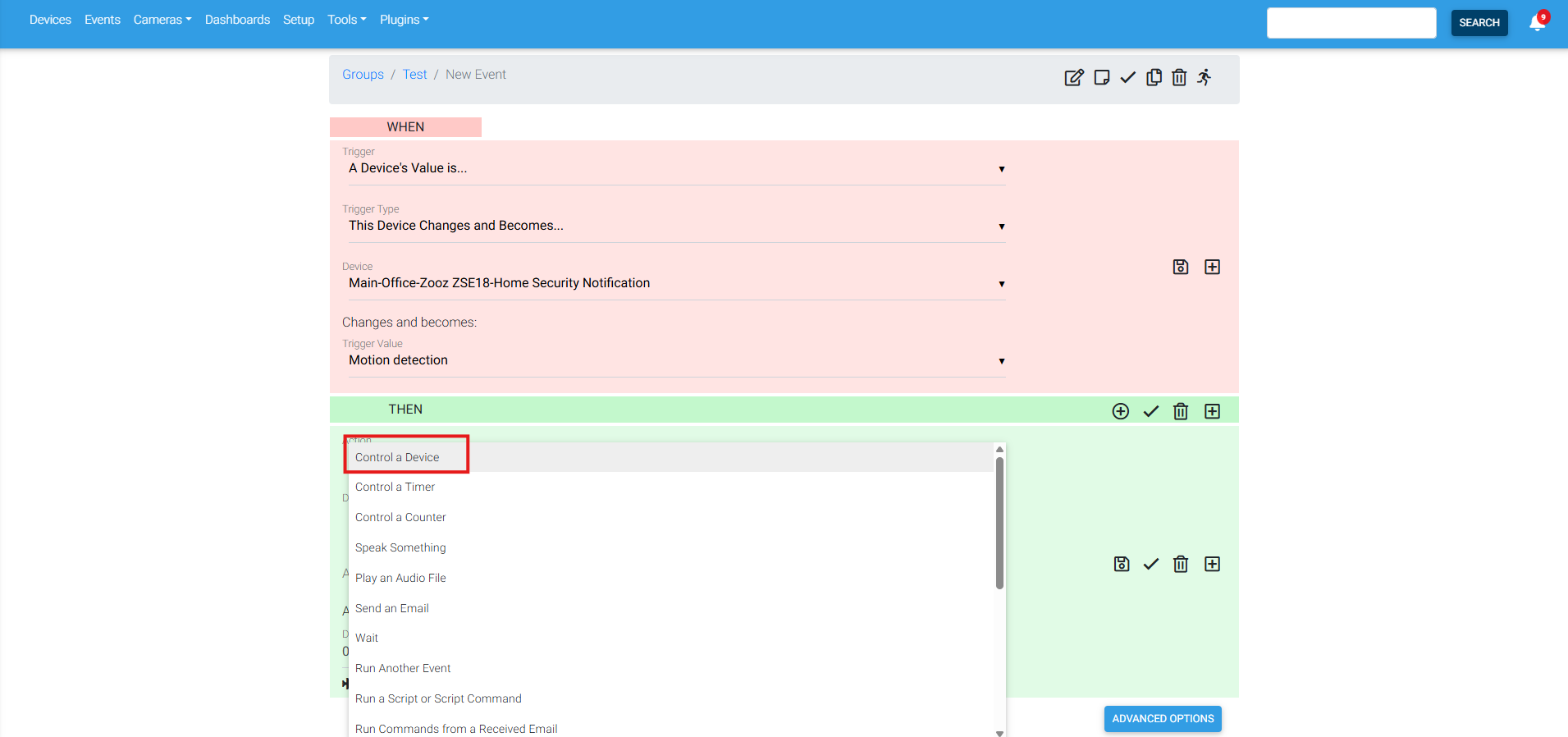 6. In the green Then section, under Action you will select Control a Device: