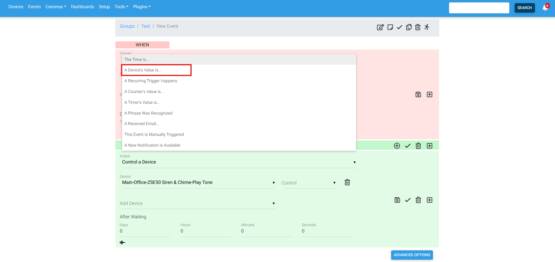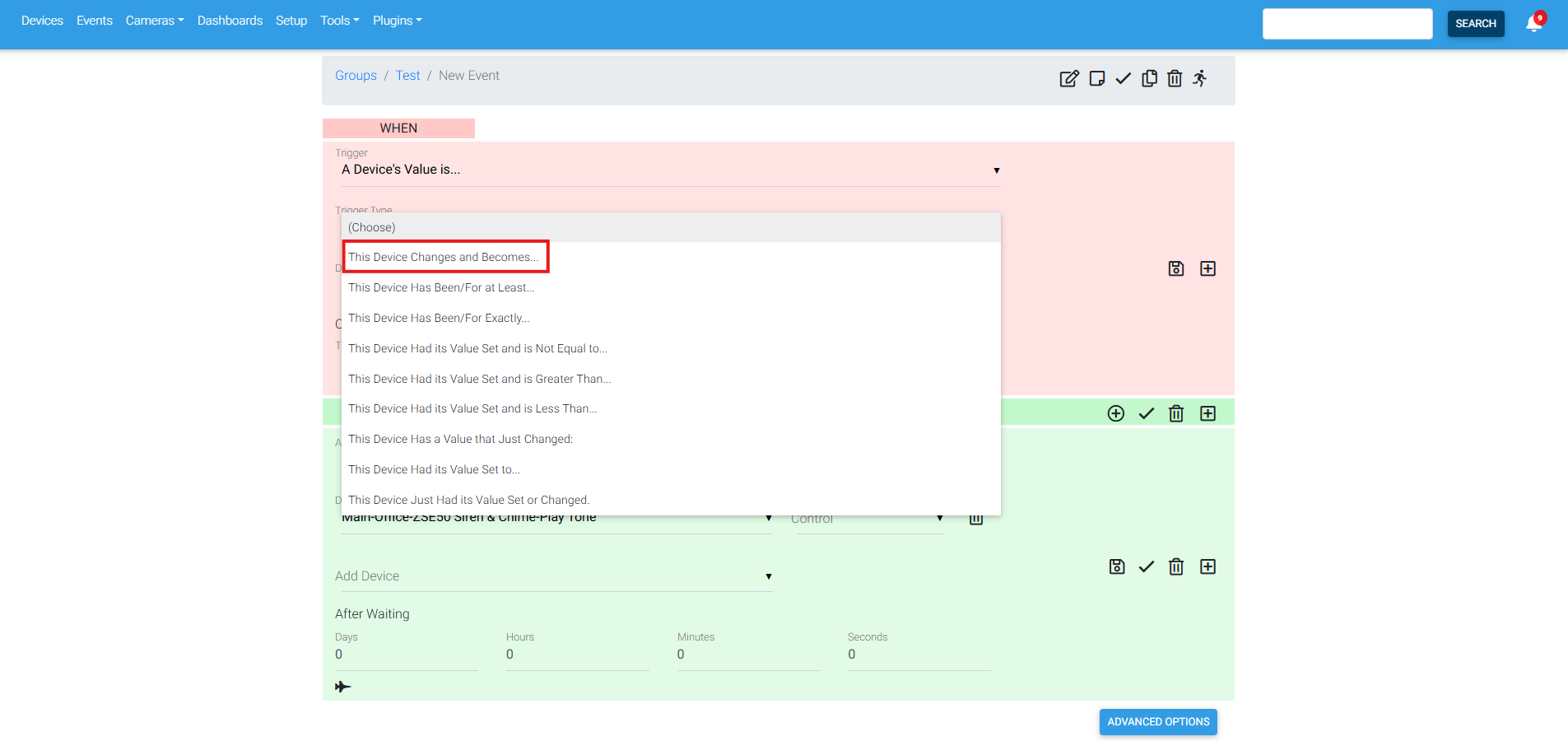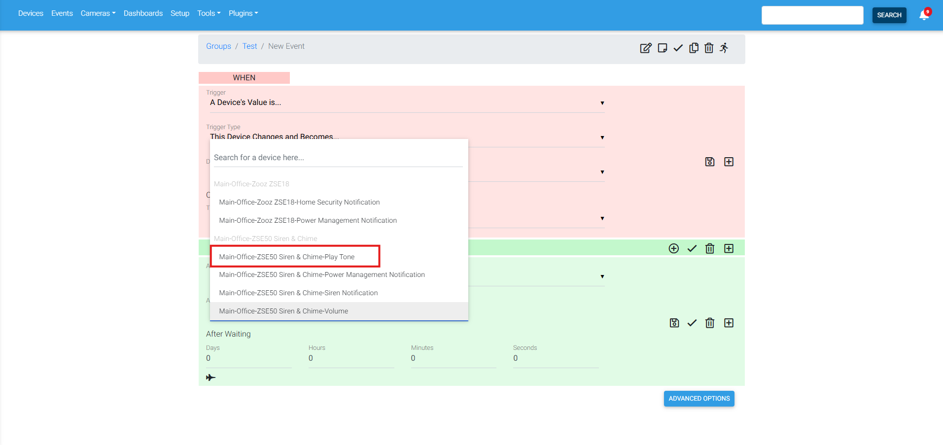 7. Under Device, we are selecting ZSE50 Siren & Chime - Play Tone.
