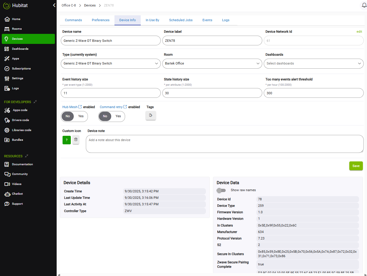 For now, the ZEN78 will be recognized automatically via the Generic Z-Wave DT Binary Switch driver. It will have on/off capabilities and access to some of the advanced parameters; however, no power monitoring is available using this basic driver. We've included screenshots below detailing how the unit will display via the Generic Z-Wave DT Binary Switch driver.