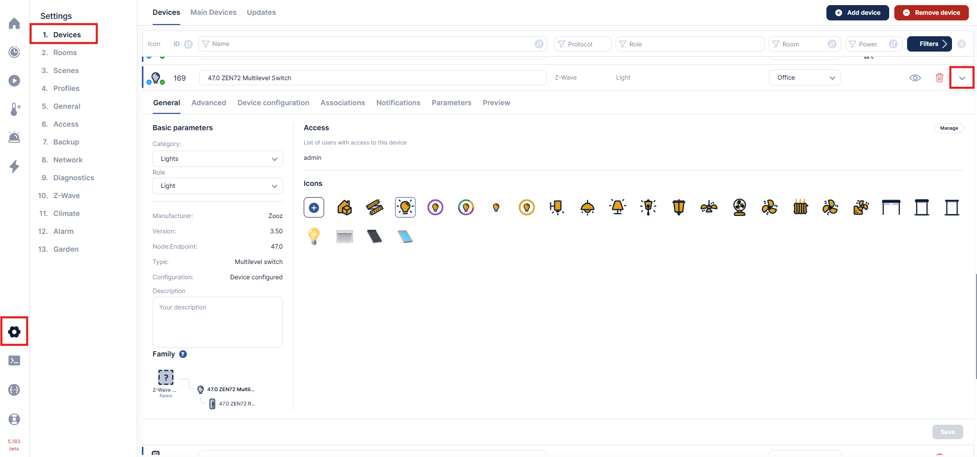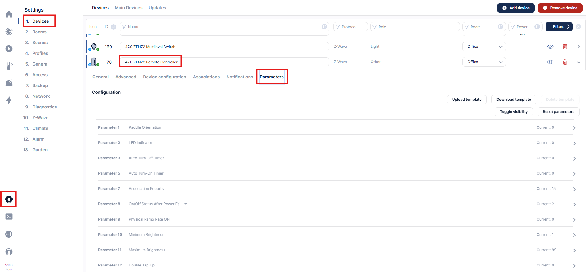 2. Click on Settings cogwheel > Devices and scroll to Dimmer/Switch A (main switch controlling the load). In the below example, this is the ZEN72 Dimmer. Your Zooz switch will display as two devices: an on/off or a dimmer device and a remote controller device. Click on the arrow next to the remote controller device for the Zooz switch you would like to program > click Parameters.