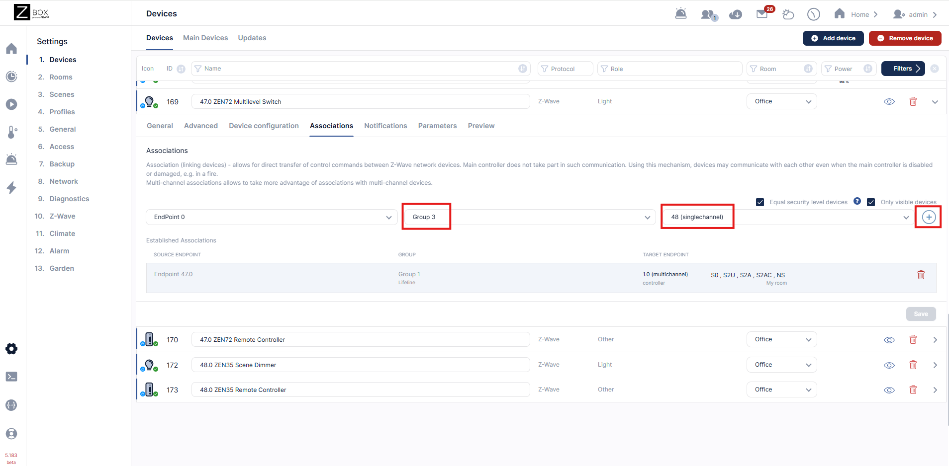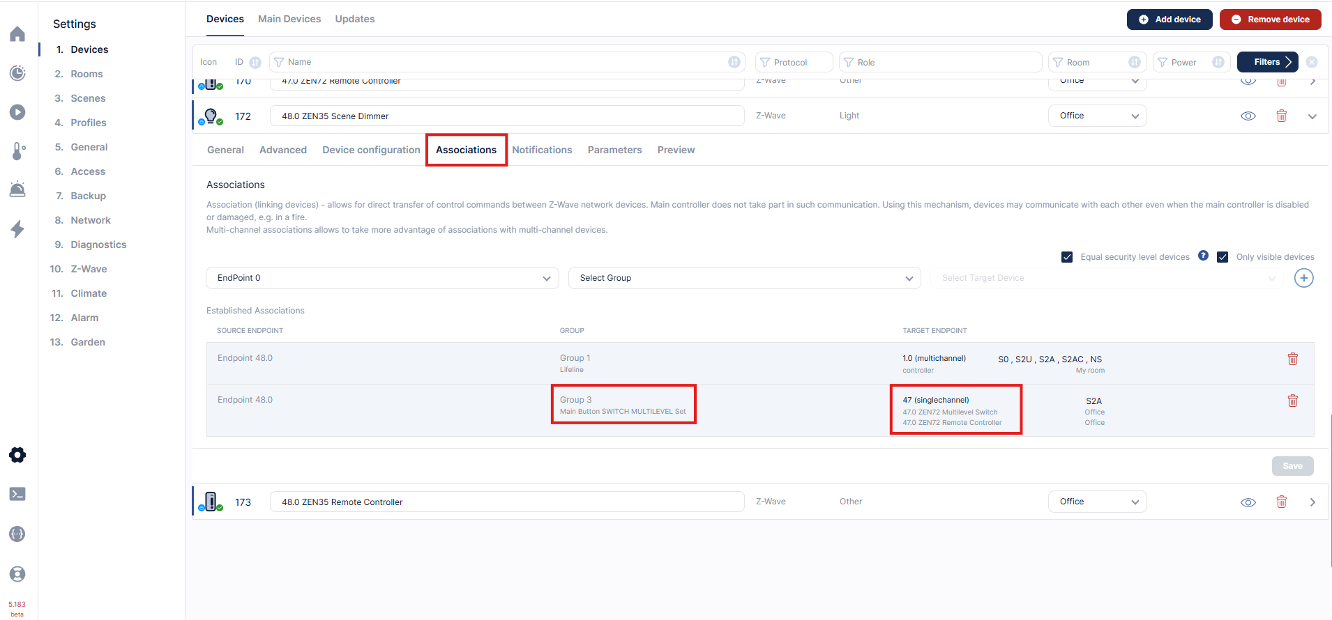 2. Select Associations. The Endpoint will stay at 0. Select Group 3 under Groups. Select your secondary dimmer as the target device (in our example this will be the ZEN35 Scene Dimmer). Note that the device is denoted by its node ID (48), which can be seen at the bottom of the screenshot as well. Click + to add the association.