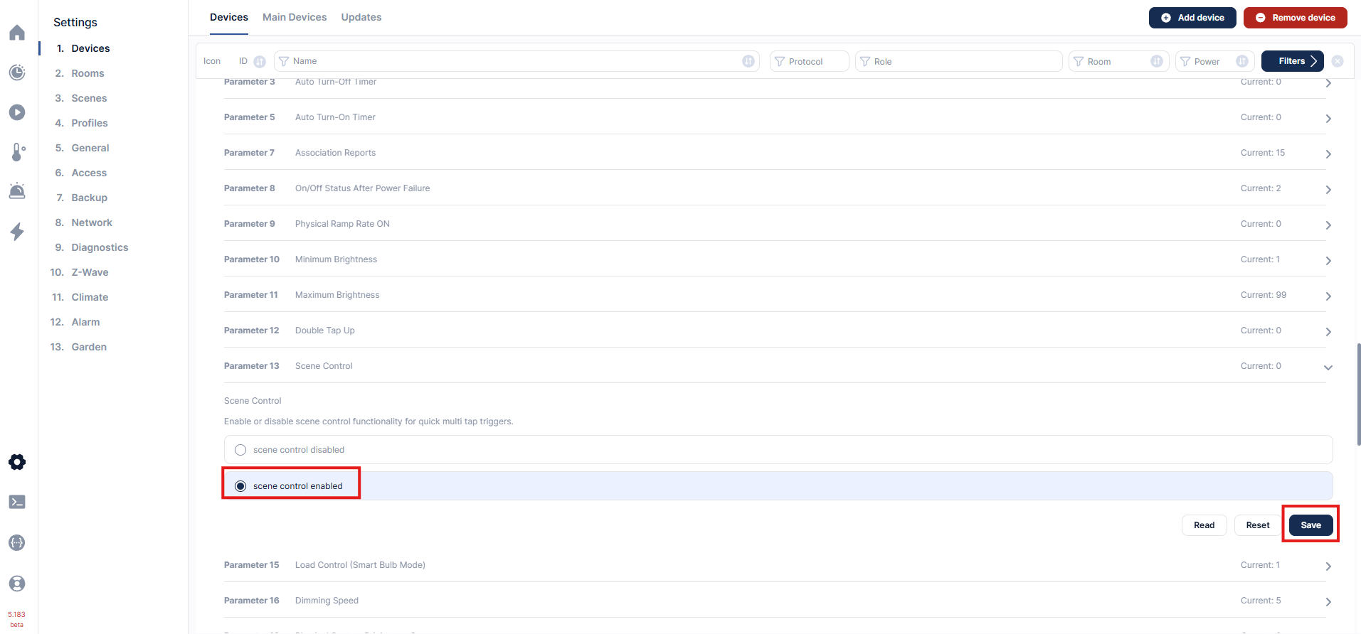 3. You'll see the settings for the device listed - click on the arrow next to the Scene Control setting to enable it. Click Save.