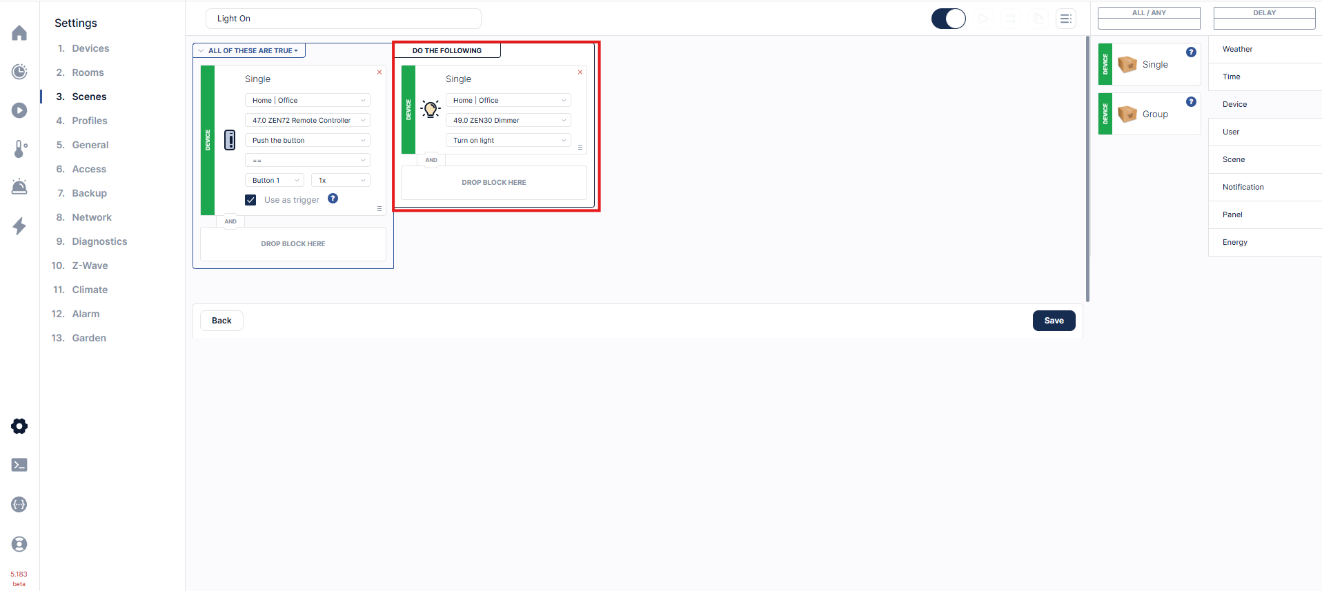 6. The ZEN72 will be automatically populated in the first section of the block scene builder. Drag and drop the Single device tile to the Do The Following section. Select your remote dimmer; in this example we're using the ZEN30. Set the behavior to turn on the light. Click Save when done.