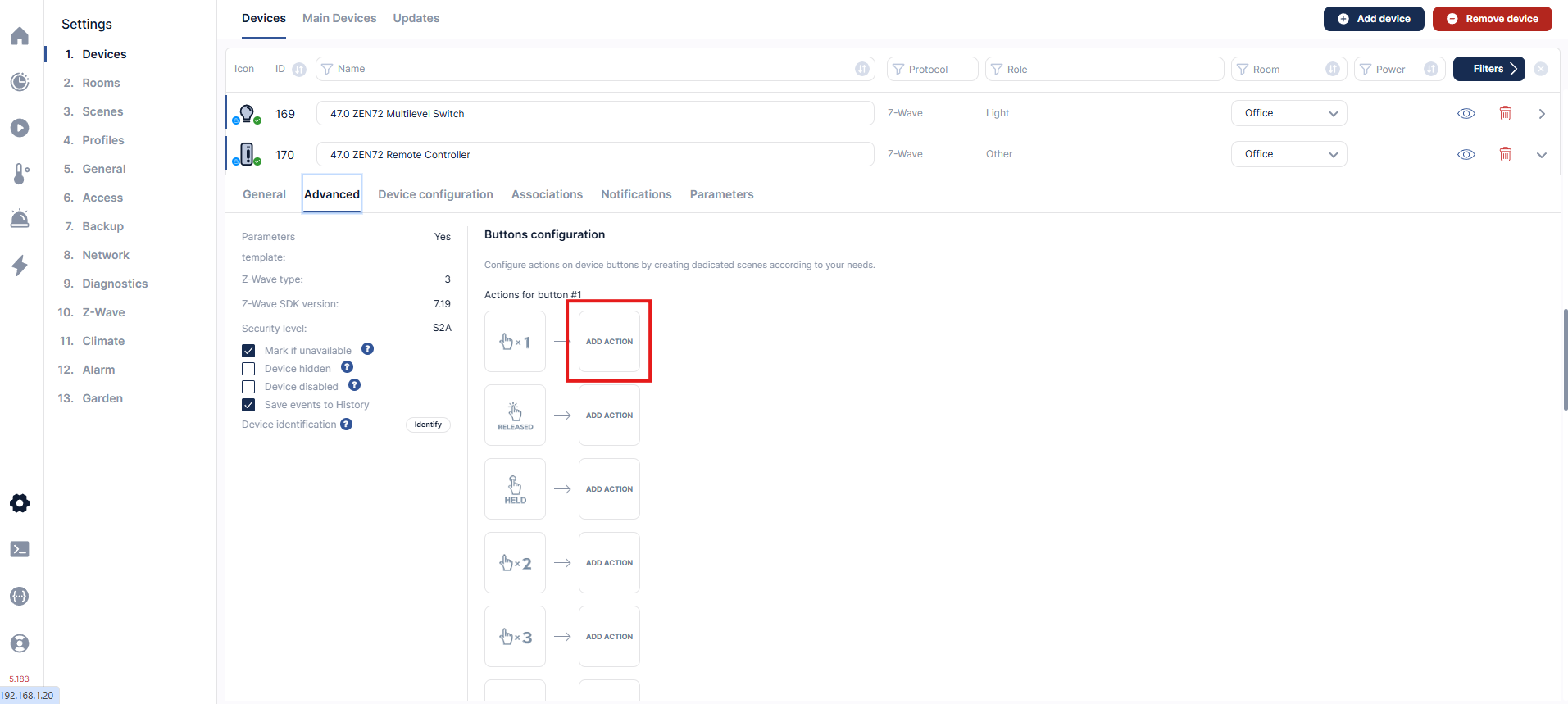4. Click on the Advanced tab to see the button trigger menu and assign actions to the paddles of your switch. Button 1 refers to the top paddle and button 2 refers to the bottom paddle on your switch. Simply click on the "ADD ACTION" button to start a new scene for the trigger of your choice.