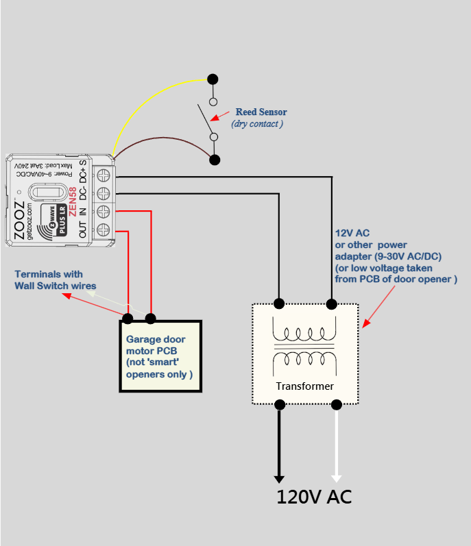 The diagram below shows an installation with a simple one-button garage door switch and the ZEN58 Low Voltage Relay with an optional wired dry contact reed sensor. If this matches your installation, please follow the below diagram to wire the ZEN58 near the garade door opener. In most setups, there is a power outlet available for the opener, so the ZEN58 can be powered from our 12V DC 0.5A power supply in the same location.