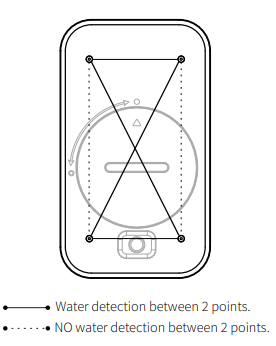 Simplemente coloca el sensor sobre una superficie plana con las 4 sondas tocando el suelo para obtener mejores resultados. El sensor detectará una fuga cuando el agua llegue a uno de los 2 pares de sondas ilustradas en el dibujo.