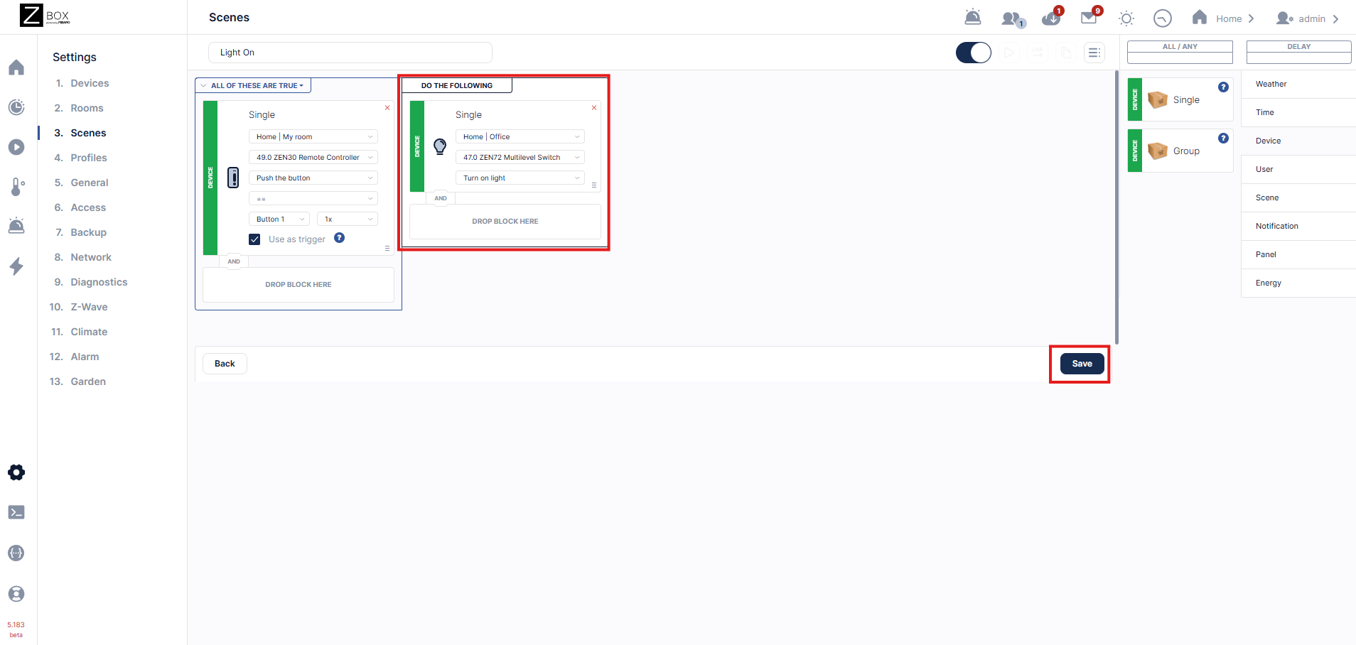 6. The ZEN30 details will be automatically populated in the first section of the block scene builder. Drag and drop the Single device tile to the Do The Following section. Select your main dimmer (load dimmer); in this example we're using the ZEN72. Set the behavior to turn on the light. Click Save when done.