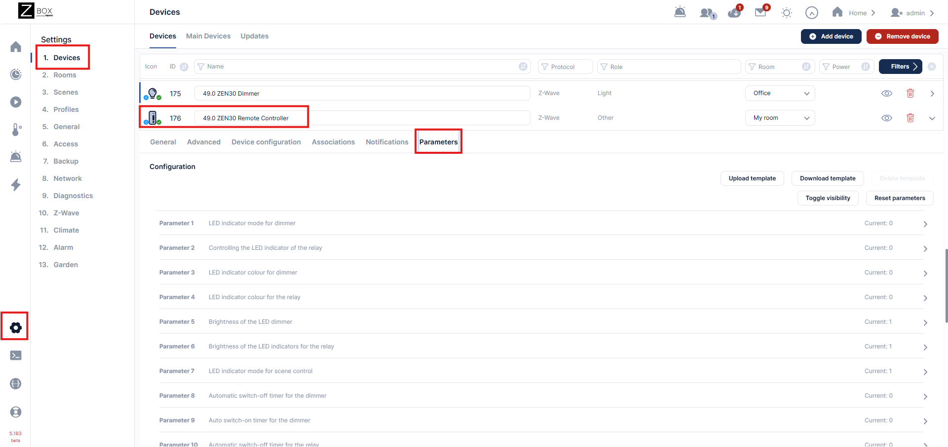 2. Click on Settings cogwheel > Devices and scroll to Dimmer/Switch B (no-load connected). In the below example, this is the ZEN30 Double Switch. Your Zooz switch will display as two devices: an on/off or a dimmer device and a remote controller device. Click on the arrow next to the remote controller device for the Zooz switch you would like to program > click Parameters.