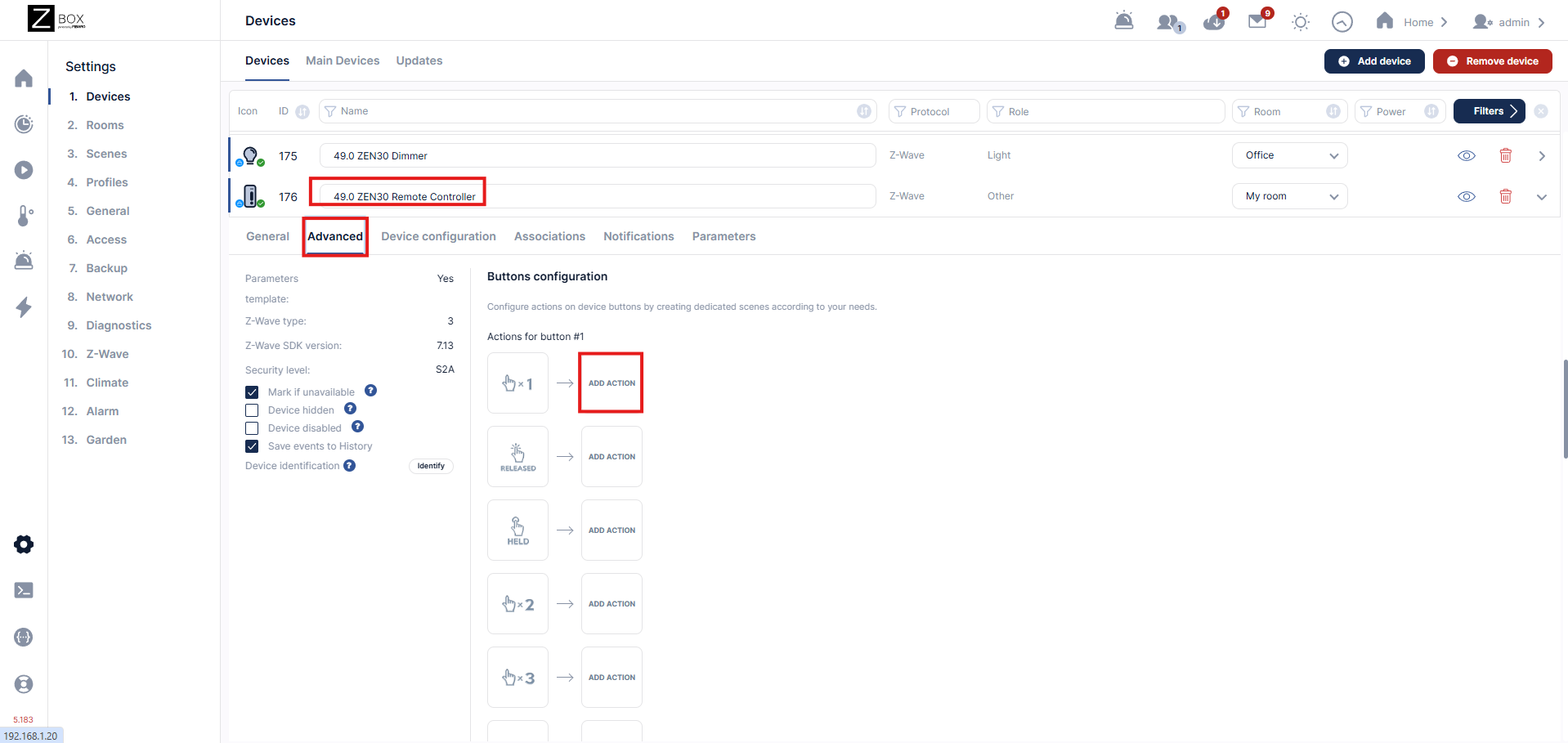 4. Click on the ZEN30 Remote Controller's Advanced tab to see the button trigger menu and assign actions to the paddles of your switch. Button 1 refers to the top paddle and button 2 refers to the bottom paddle on your switch. Simply click on the "ADD ACTION" button to start a new scene for the trigger of your choice. For our example, we are using the single tap on the upper paddle (button 1).