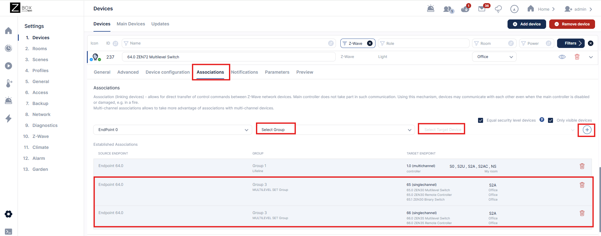 2. Select Associations. The Endpoint will stay at 0. Select Group 3 under Groups. Select your secondary dimmers as the target devices (in our example this will be the ZEN35 Scene Dimmer and the ZEN30 Double Switch). Click + to add each association. In the screenshot below, you can see that the ZEN30 Dimmer and the ZEN35 Scene Dimmer have been added to Group 3 under the ZEN72 (main dimmer).