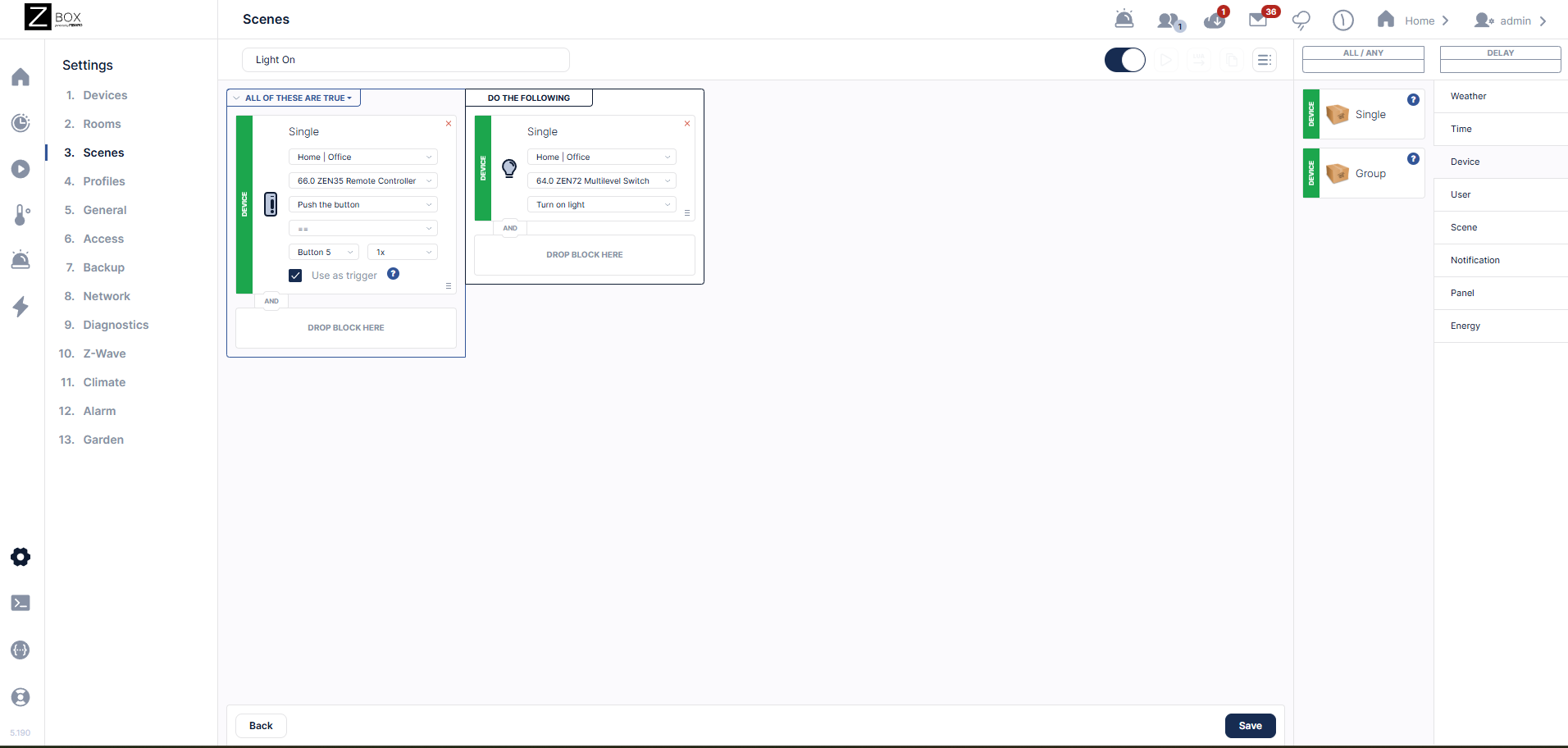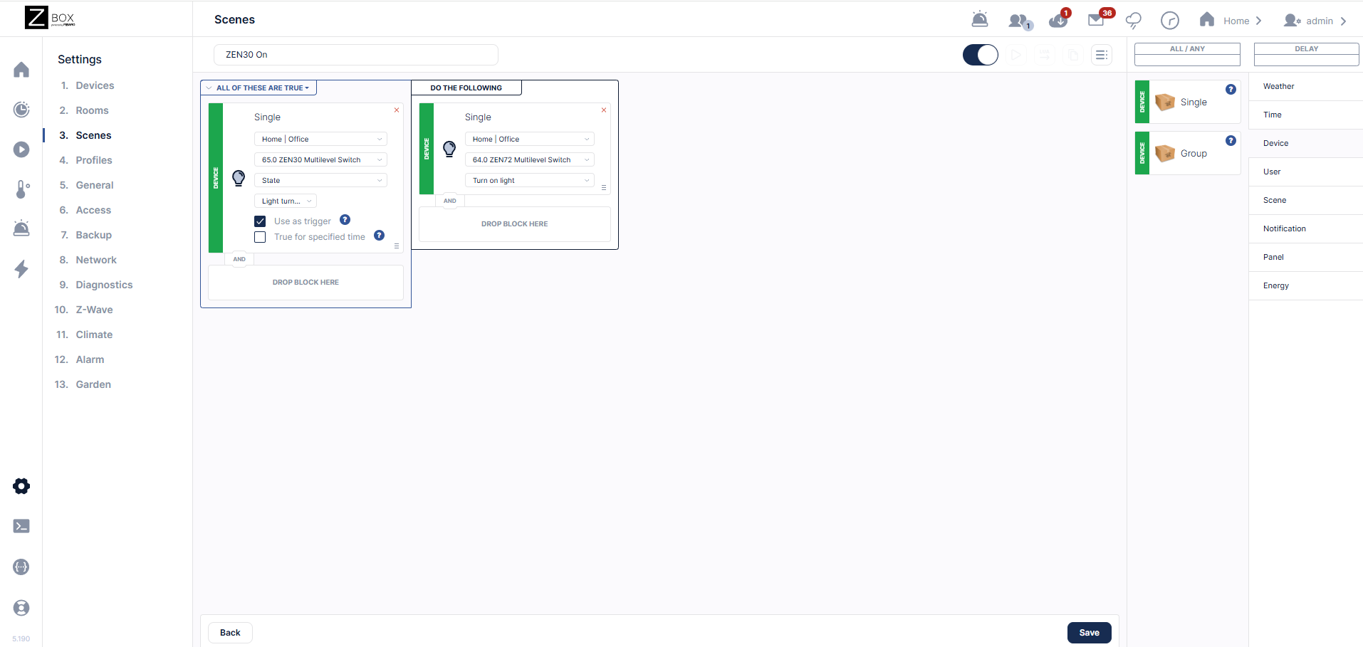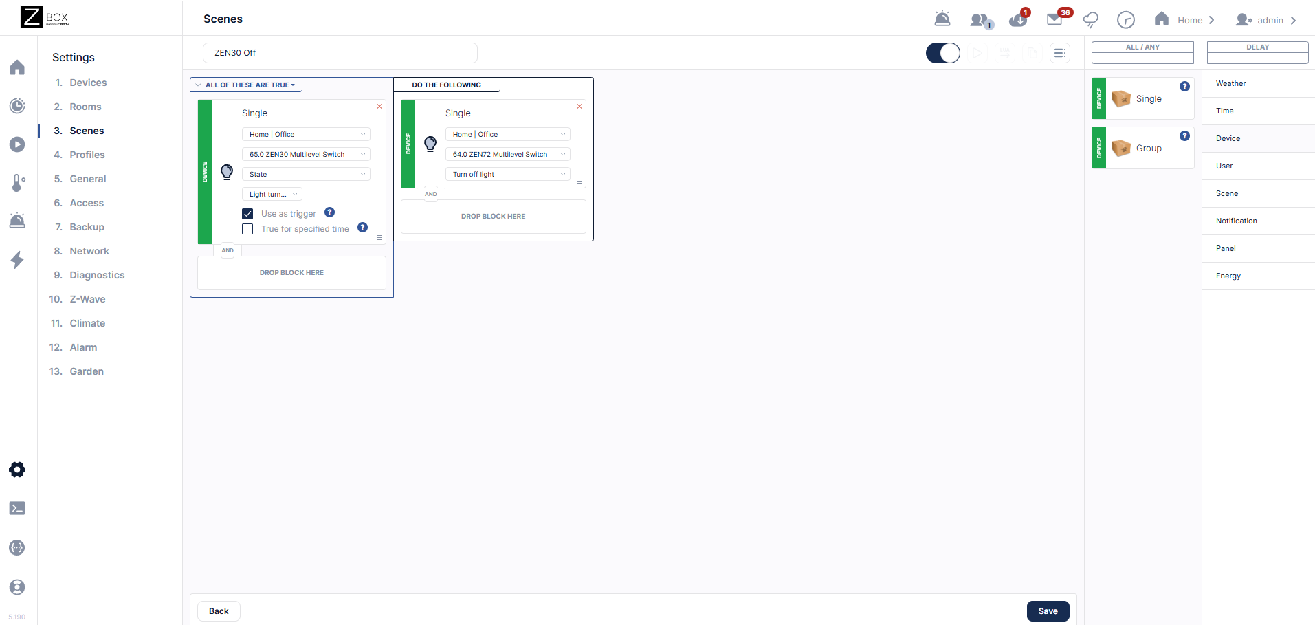 2. For the next two scenes, we'll use the second remote dimmer (ZEN30) and use the status of this switch to turn on and off the ZEN72: