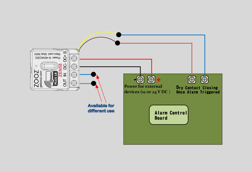 Connect the alarm panel’s dry contact relay output to the ZEN58 dry contact input terminals. When the panel activates the relay, the ZEN58 will detect the contact closure and convert this signal into a Z-Wave event, allowing you to create automations or push notifications in your smart home system.