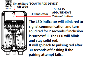 SmartStart: use the hub UI / app to scan the SmartStart code on the device. The SmartStart QR code and security PIN are located on top of the relay’s cover so you can easily scan the code when the device is mounted. Simply power the device for SmartStart inclusion, it will be added automatically. If using SmartThings, you may need to tap the Z-Wave® button on the relay 3 times quickly to complete the inclusion process.
