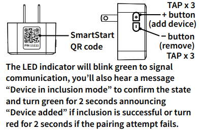 SmartStart: Verwenden Sie die Benutzeroberfläche oder App des Controllers, um den SmartStart Code auf dem Gerät zu scannen. Der SmartStart QR Code und die Sicherheits PIN befinden sich auf der Oberseite der Sirene, sodass Sie den Code einfach scannen können, wenn das Gerät eingesteckt ist. Versorgen Sie das Gerät einfach mit Strom für die SmartStart Einbindung, es wird automatisch hinzugefügt. Bei SmartThings müssen Sie möglicherweise die + Taste an der Sirene 3 Mal schnell drücken, um den Einbindungsprozess abzuschließen. Siehe unten für Controller spezifische Anweisungen.