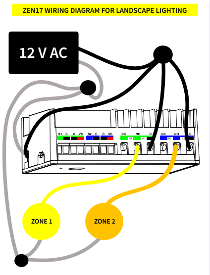 CONNECT ZEN17 TO THE LIGHTS: Connect the negative from the power supply to the - (negative) terminal on the ZEN17 and to one side of the light. Connect the positive from the power supply to the + (positive) terminal on the ZEN17 and to the C (common) terminal on R1/R2 . Then connect the lights to NO on R1/R2 to complete the circuit, just as shown in the diagram below.
