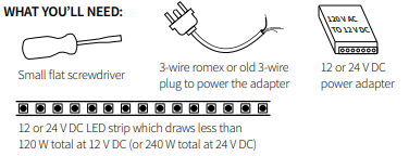 - REVIEW ALL CONNECTIONS: Please verify that you’ve identified all wires and terminals correctly before restoring power to the adapter and testing the set-up. Make sure that a 24 V DC LED strip is powered by a 24 V DC power supply with enough power to handle the length of your LED strip. This is very important!