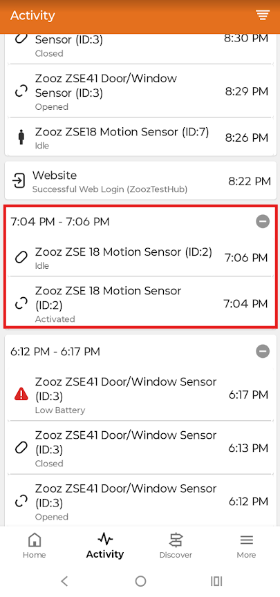 2. Activity will show the recent sensor activity, showing when the sensor reported Activated and when it returned to Idle, along with any battery alerts.