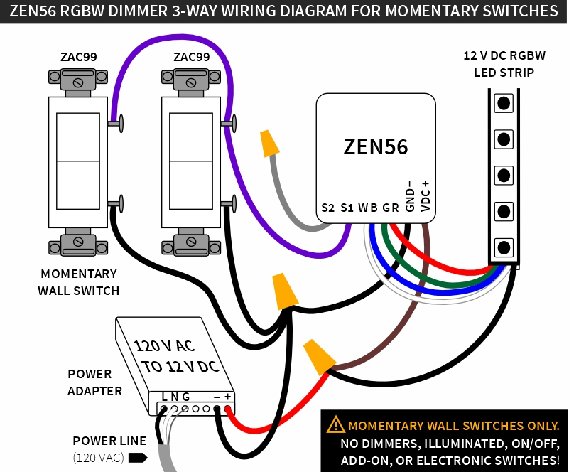 Installing the ZEN56 RGBW Dimmer in a 3 way setup allows you to control the same lighting load from more than one location. Because the ZEN56 is designed differently from a traditional mechanical dimmer, it does not use a standard 3 way switch configuration. Instead, there are two supported wiring methods depending on the type of switches you want to use and whether you can adjust device settings through your hub.