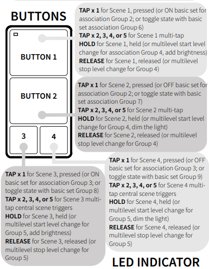 Sie müssen den Fernschalter aufwecken, wenn Sie erweiterte Einstellungen ändern oder neue Szenen oder Aktionen zuweisen möchten. Drücken Sie die untere linke Taste 6 Mal so schnell wie möglich, um das Gerät aufzuwecken. Die LED-Anzeige leuchtet während des Aufweckvorgangs durchgehend blau und erlischt, wenn das Gerät das Z-Wave-Funkmodul wieder ausschaltet.