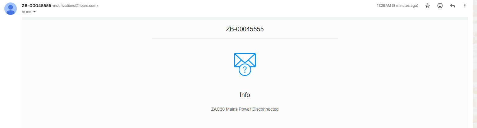 Click Save when you're done. Now, whenever the ZAC38 is disconnected from mains power, you will receive an email notification with your custom message: