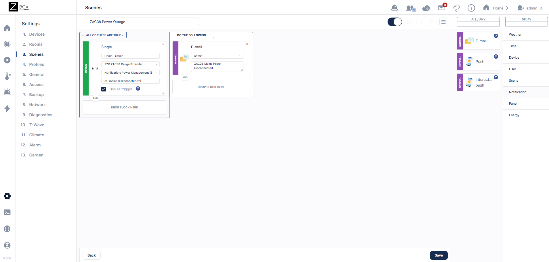 Next, in the far right column, you can use any of the listed boxes for the action part of your scene. In our example below, we've elected to send an email notification to the admin with a custom message.
