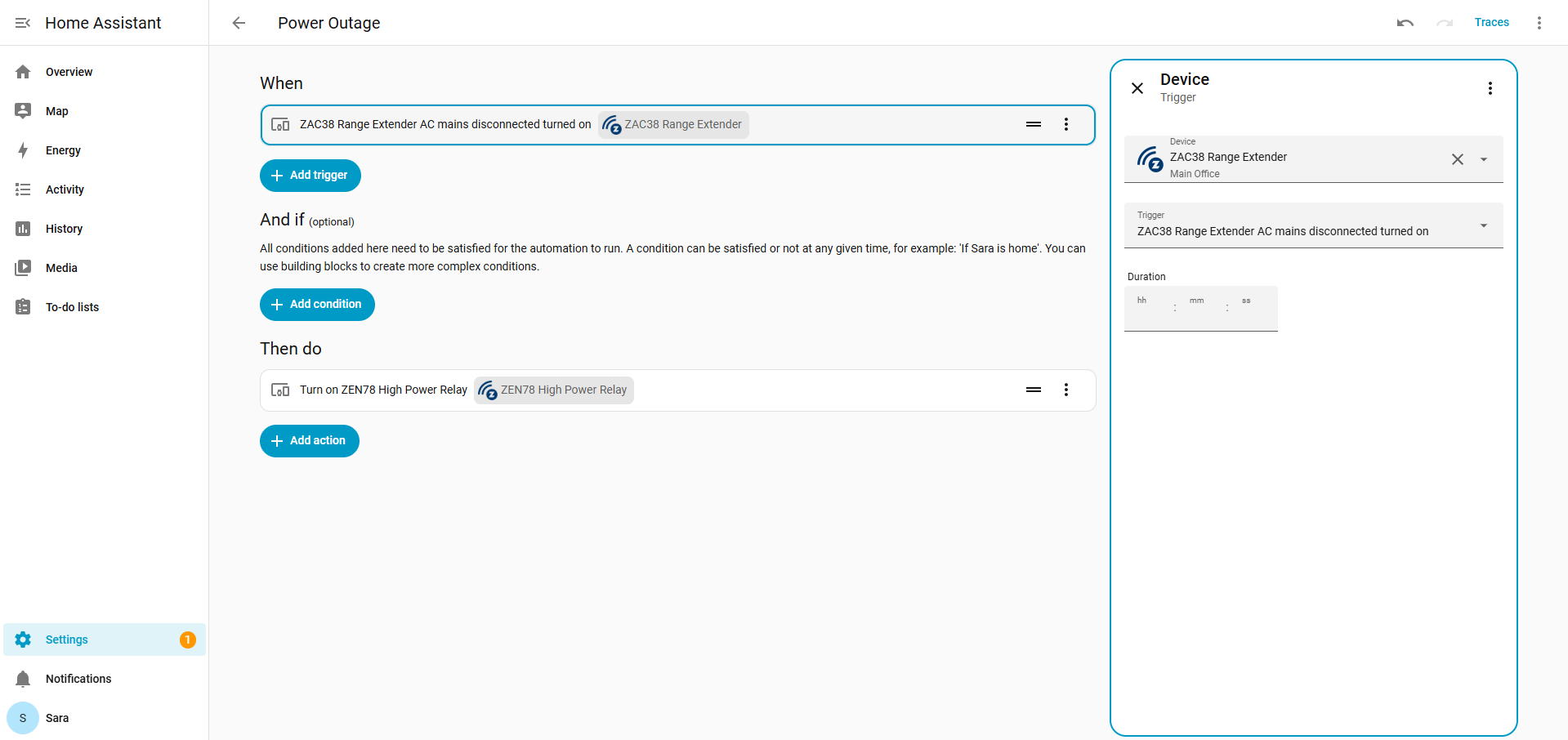 In this knowledge base example, we will walk through how to use the power outage event to send a notification to the user. However, the same reported event can be used for any type of automation you want to create. This includes sending alerts, triggering scenes, activating other devices, or combining it with additional conditions in your automation system.