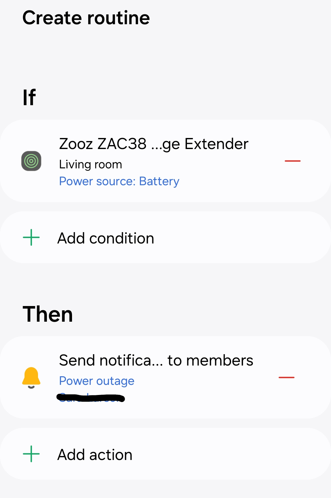 In the SmartThings app, go to Routines > + > and use the Power Source Battery under the ZAC38 as your condition. The scene below shows how to program a notification, but you can elect any available option in the Then portion of the routine.