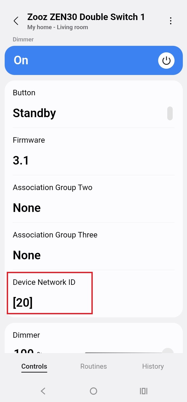1. First go the device you wish to trigger using the ZEN34. In the below screenshot, we are using the ZEN30 Double Switch. Click on the Device Tile > Controls > Device Network ID. Make a note of this ID, as you will use it in the following steps.
