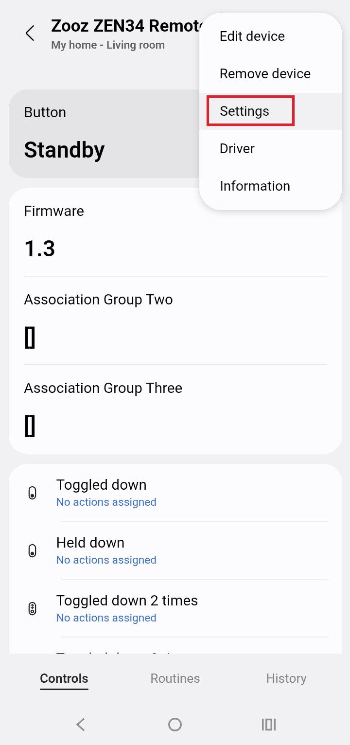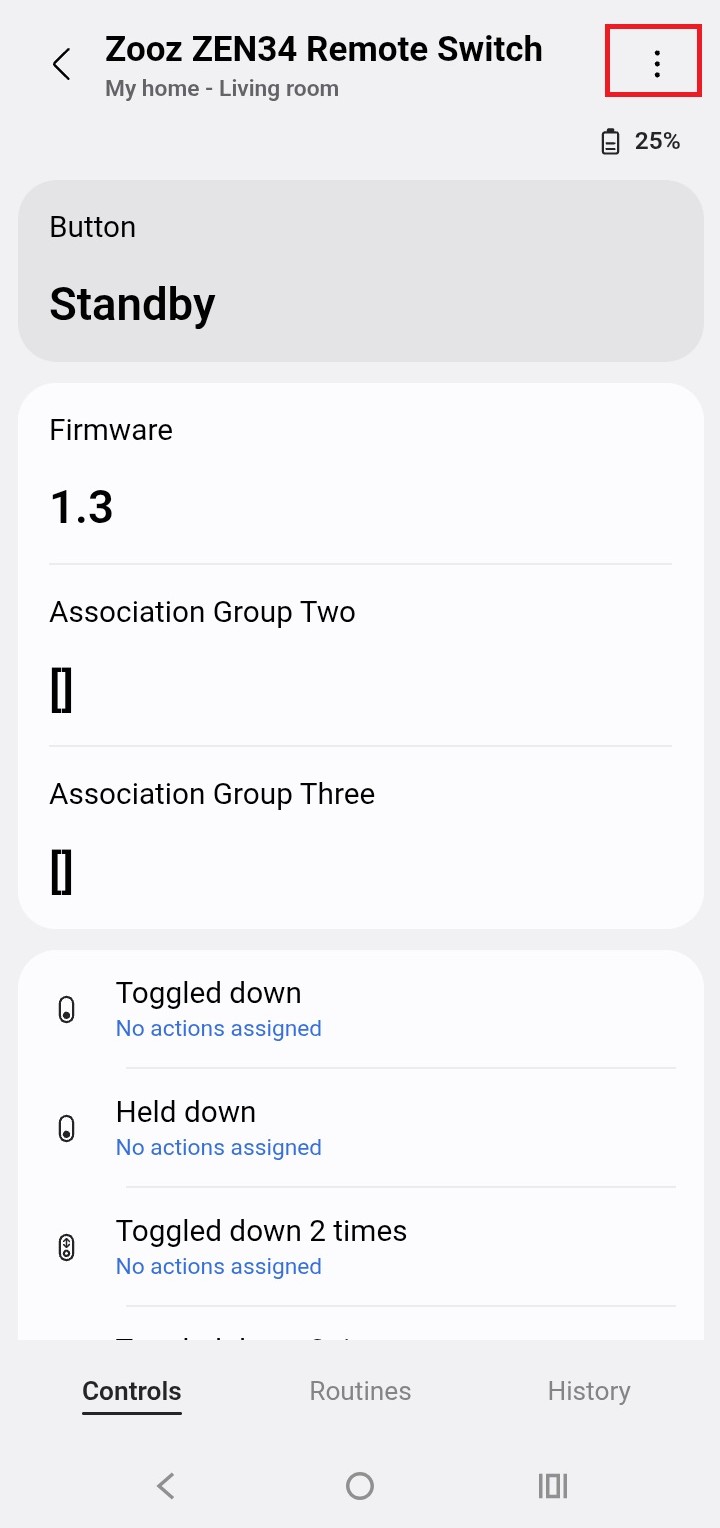 You can control devices and activate scenes using this remote by assigning custom actions to selected button triggers. From the SmartThings app, click on the ZEN34 device tile. You can either program the remote from the Controls screen or the Routines screen.